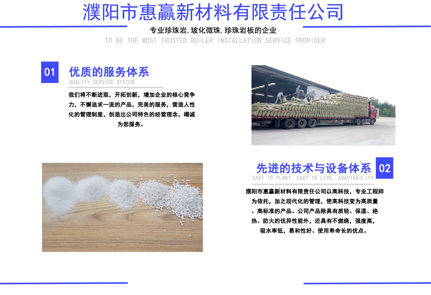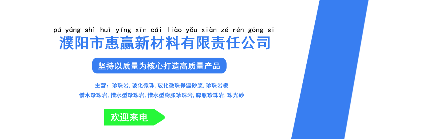 濮陽市惠贏新材料有限責任公司是一家專業生產保溫材料的廠家,位于范縣王樓鎮工業區,專業生產珍珠巖、珍珠巖保溫板、玻化微珠等保溫建材,主要用于外墻保溫、屋面保溫、園藝等領域,產品暢銷國內外,深受客戶一致好評。我們擁有優秀的產品和服務,在成立以來都以誠信對待客戶! 公司擁有各類專業人才,技術人員50人,運輸40人,專業的十多輛運輸車輛。產品銷售網絡遍及國內20多個省市,十幾年來,通過公司的不懈努力和誠信經營理念,產品質量可靠,價格合理,深受廣大客戶認可和好評! 我公司本著以客戶為本,客觀實際,創新發展的原則,在追求完美極致的道路上努力打造行業新標準,我公司憑借卓越的產品質量、完善的服務標準、良好的口碑信譽、竭誠歡迎廣大客戶前來洽談業務!...